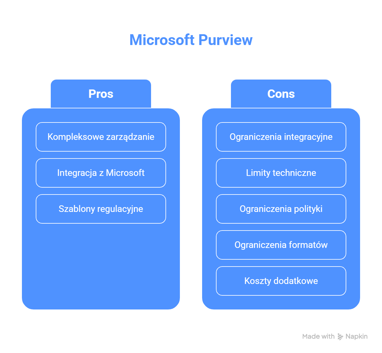 Obsługa formatów plików także pozostawia wiele do życzenia. Microsoft Purview radzi sobie głównie z formatami Microsoft, a wsparcie dla multimediów i formatów branżowych jest ograniczone. Zaawansowane funkcje analityczne wymagają często licencji E5 lub droższych dodatków. Czy to nie powinno działać od razu?